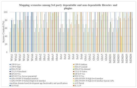 The apps are synchronized with the rule-based API, which oversees their behavior. New plug-ins and updates are upgraded based on rules and threshold values specified in Table 6 and Table 7. Figure 5 shows the mapping scenarios among third-party dependable and non-dependable libraries and plug-ins. The x-axis represents the five modes of mobile and web apps such as WbA, HbA, IbA, GbA, and MDSD. The y-axis represents the access control involvement ranges of third-party libraries and plug-ins from 0 to 100%.