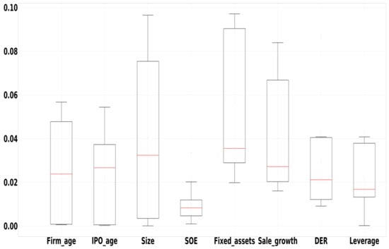 Variable importance for firm basic characteristics. Notes: this figure displays a box plot of the importance of each firm basic characteristic variable, including Firm_age, IPO_age, Size, SOE, Fixed_assets, Sale_growth, DER, and Leverage, aggregated across all machine learning models.