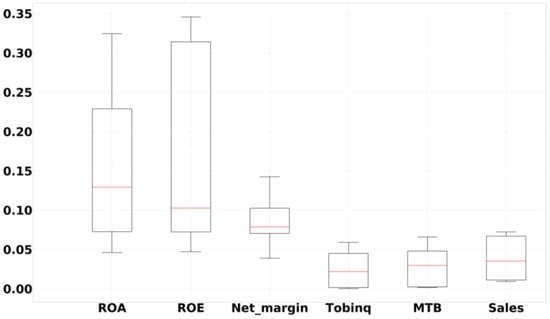 Variable importance for firm performance. Notes: this figure displays a box plot of the importance of each firm performance variable, including ROA, ROE, Net_margin, Tobinq, MTB, and Sales, aggregated across all machine learning models.