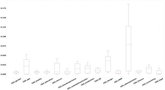 With regard to the CEO characteristics, almost all variables have positive effects on corporate risk-taking except CEO_administration, CEO_education, CEO_RD, and CEO_production, which have negative effects. For example, the impact of CEO_age on corporate risk-taking is positive; that is, older CEOs tend to have more experience and capabilities, which can help them to obtain resources and market information, enhancing corporate risk-taking [], while younger CEOs may prefer conservative investment strategies to avoid losses caused by decision-making mistakes []. In terms of CEO_outsidedirectorates, if a CEO also serves as the outside directorate in other firms, the increased CEO power and social networks encourage an optimistic risk attitude in them and greater discretion on corporate investment decisions, improving the firm’s risk behavior [,]. For CEO_tenure, Wang and Poutziouris [] explored the link between the tenure of CEOs and corporate risk-taking. They believe that with the increase in tenure, managers become more familiar with the situation of the industry and increase their risk behavior. CEO_gender, a CEO characteristics variable that has been paid more attention to in previous studies, has a positive impact on corporate risk-taking, thus supporting that female CEOs are not always risk-averse [,].