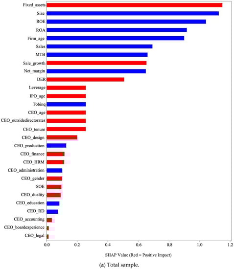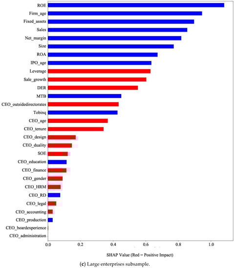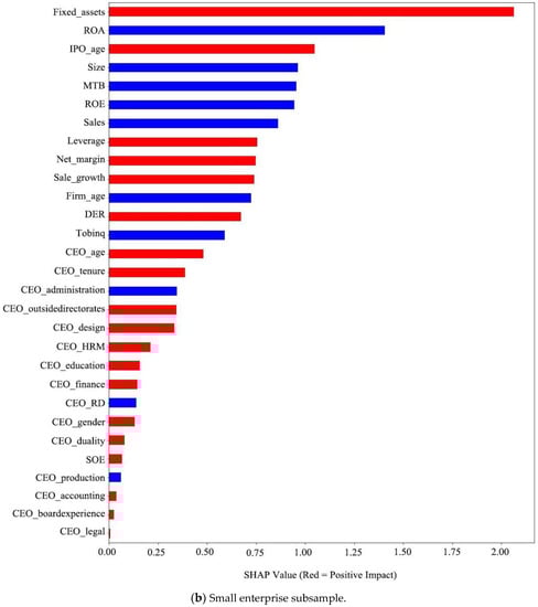 We use the SHAP approach to visualize the overall contribution and effects (positive or negative) of the firm basic characteristics, performance, and CEO characteristics on corporate risk-taking using the AdaBoost model in the total sample and subsamples (i.e., small and large enterprises). Table 5 summarizes the top ten variables, which enables us to pinpoint the motivating factors behind corporate risk-taking in the total sample and subsamples (small and large enterprises) by computing the variable’s SHAP value. The detailed overall importance and effect of all variables on risk-raking are shown in Figure 4. The horizontal axis represents the SHAP value of variables. The larger the SHAP value, the more important this variable is for predicting corporate risk-taking. The vertical axis represents each variable, and they are ordered from highest to lowest based on their importance.