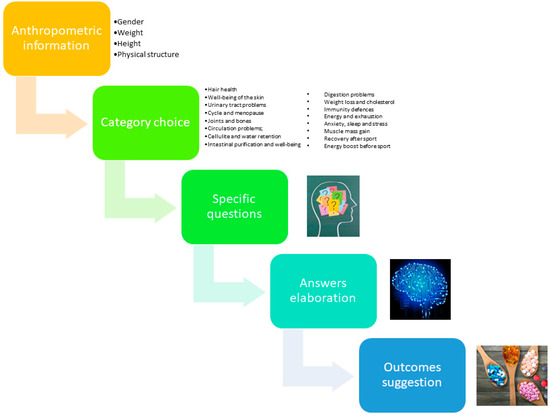 The Digital Advice examined is a proprietary product of the considered start-up, MyLab Nutrition Group®; therefore, only the general structure is shown in Figure 2. The algorithm behind the technology is outside the scope of this study.