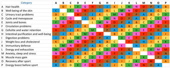 - Outcome evaluation: To validate the AI-based advice outcomes, the panellists conducted a series of simulations to provide representative cases of reality. In each simulation, the expert impersonated a hypothetic customer to answer the advice questions. A 2 × 2 + 1 scheme was used for this purpose, as reported in Figure 3. The 16 categories were combined, such that each simulation foresaw the coexistence of three categories in the same subject and different clinical problems. The following characteristics were also assigned to complete the simulated consultation: gender, age, constitution (weight and height), presence/absence of pathologies, and allergies/intolerances. The different colours in the table reflect each of the seven panellists to whom the various simulations to be processed were randomly assigned.