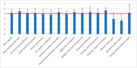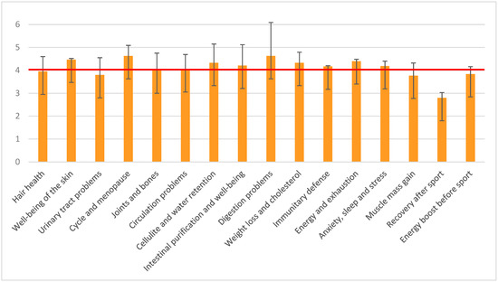 Regarding the advice questions, the main concerns found by experts were related to the three categories associated with sport. Panellists highlighted an incorrect description of muscle pain in the questions. Specifically, while the advice refers to lactic acid, experts argue that muscle pain in the days following training is due to delayed onset muscle soreness (DOMS). Therefore, it would be appropriate for the company to revise the questions which include this inaccuracy. This feature is also highlighted by the average trend line in Figure 4. Two of the three categories concerning sport, i.e., “muscle mass gain” and “recovery after sports”, had the lowest scores, which were below the adequacy threshold (3.00).