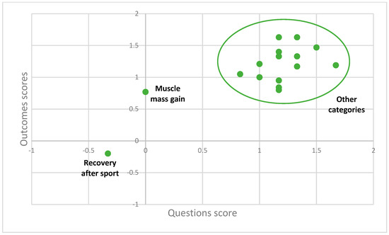 Regarding the comparison between questions and outputs, as shown in Figure 6, almost all categories were located in the positive–positive quadrant, indicating good results in both evaluations. The “muscle mass gain” category was situated on the y-axis, expressing a barely sufficient assessment in question formulation. The only category out of this quadrant was “recovery after sport”, which was in the negative–negative quadrant, indicating a lack of efficacy of the AI-based advice in this category.