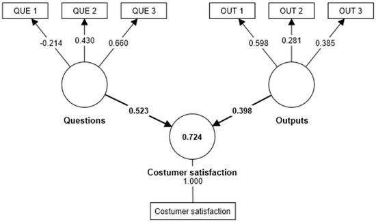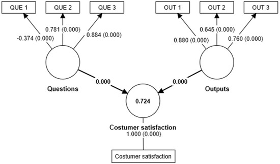 The results of the hypotheses testing are presented in Table 4. Hypothesis 1 suggests that the good construction of the questions in the AI-based advice under study positively affects customer satisfaction, which was accepted (β = 0.527, p = 0.000), since the significant value was less than 0.05. Hypothesis 2, proposing that AI-based advice output positively influences customer satisfaction, was also accepted (β = 0.394, p = 0.000). Hence, it can be concluded that all of the proposed hypotheses were accepted. The results of the structural model are shown in Figure 8.