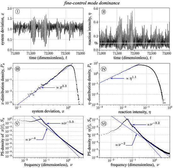 - Under normal conditions, i.e., when the subject’s control is not close to failure and no urgent actions are necessary, the time scale characterizing the current subject’s reaction should be about the reaction time at the instability onset, . So the temporal scale is used below as the time unit. In these terms, the equation governing the system dynamics under the subject’s control (specified in item ii) is reduced to the dimensionless form (1), and we obtain the relationswhere it follows that, first, the value may be treated as the measure of the subject’s reaction intensity. Second, because the subject’s actions in governing an unstable system cannot be slow in comparison with the instability development, we may consider the inequalities and, thereby, to hold beforehand.