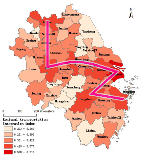 According to the evaluation index system of regional transportation integration (Table 2), we calculated a score of regional transportation integration for all 41 cities in the YRD region. Using the automatic breakpoint method in ArcGIS, these scores were divided into five categories from low to high (see Figure 3). Here are a number of findings based on the results.
