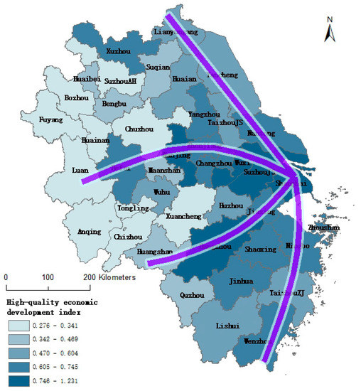 First, it is very clear that Shanghai (1.230) is the absolute center in terms of high-quality economic development in the YRD region, while a huge difference can be found not only among cities (Chizhou had the lowest score of 0.276), but also among provinces. For example, cities in Zhejiang province had relatively high scores overall, while cities in Anhui province had relatively low scores. The gaps of scores among cities were relatively small in these two provinces. On the other hand, cities in Jiangsu province varied dramatically, as Suzhou, Wuxi, and Nanjing had high scores, but other cities scored very low. Second, a gradual decreasing pattern can be found from the eastern coastal areas to the western inland areas. Overall, it can be divided into two groups: high-value agglomeration and low-value agglomeration. An inverse K-shape (purple lines in Figure 4) can be drawn according to the cities with high scores. The Shanghai–Nanjing–Hefei and Shanghai–Hangzhou–Ningbo agglomerations can be found as the leading areas for high-quality economic development. Again, this showed that Shanghai is the central city in the YRD region to which all high-value agglomerations have to connect.