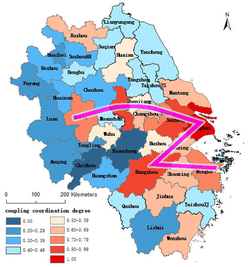 The results of the coupling coordination degree are visualized in Figure 5. Again, with Shanghai as the center, there is a gradual decrease from the eastern coastal areas to western inland areas. A Z-shaped belt (pink line in Figure 5) can be drawn according to high coupling coordination degree areas, forming a Shanghai–Nanjing–Hefei and Shanghai–Hangzhou–Ningbo agglomerations. These results can be correlated with the YRD integration planning as the Shanghai–Nanjing–Hefei and Shanghai–Hangzhou–Ningbo areas have the advantage of being located along the river and along the bay, where the expressway, high-speed rail, and water transportation are quite developed. Additionally, most of these cities are provincial, sub-provincial capitals, and economically developed cities, which have already formed into the earliest urban agglomerations in the YRD region.