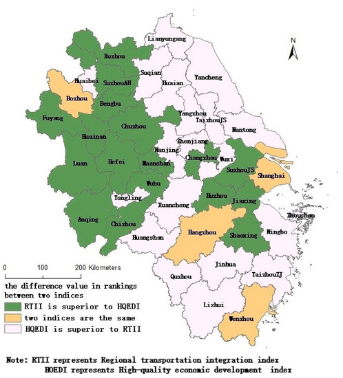 By comparing the results from the coupling coordination analysis with the developmental gap between the regional transportation integration and high-quality economic development, not only can we have a full picture of the situation of regional integration of the YRD region, but also we can have an in-depth discussion about the development problems of the different areas.
