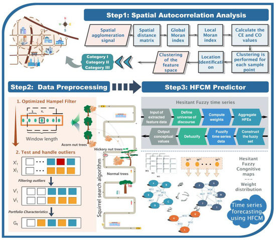 In order to solve the above problems, an innovative spatiotemporal hybrid forecasting model based on adaptive feature extraction and improved fuzzy cognitive maps is proposed. It consists of three modules: a spatial correlation analysis module, data preprocessing module, and fuzzy information forecasting module. For the spatial correlation analysis module, a spatial feature extraction model based on the Moran index and local gravitational clustering (LGC) is designed that can combine spatiotemporal features and extract key influencers from complex data to represent a variety of complex issues in a visual way. For the data preprocessing module, a novel adaptive feature extraction model optimized by the squirrel search algorithm (SSA) is proposed to process and correct the outliers of the original series. Finally, novel hesitant fuzzy cognitive maps (HFCM) are proposed for the fuzzy information forecasting module. The fuzzy logic in the original model is optimized by hesitate fuzzy information, and the forecasting at the numerical level is transformed into the forecasting of probability at the interval level.