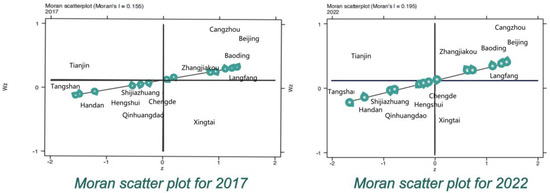 Most of Moran’s I belong to (−1, 1), but there are also extreme cases, that is, Moran’s value appears outside this range [32]. When Moran’s I is closer to 1, the more pronounced the positive spatial correlation and the closer the relationship between cities. When Moran’s I is closer to −1, the more pronounced the negative spatial correlation and the greater the spatial difference between cities. When Moran’s I is 0, the space is random, indicating that cities are not correlated.