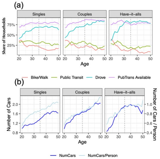 Figure 2 illustrates how different mode use and car ownership patterns evolve within each cohort in the life history calendar. Respondents reported increasing regular use of a personal vehicle as they grow older, while there was a decreasing trend in taking public transit and active modes, such as walking and biking, over time. When taking a deeper look at the driving pattern across cohorts, “Singles” started driving more after the age of 20, and the car usage remained constant until it started to drop at age of 45; “Couples” increased their car usage consistently throughout their life between 20 and 50 years old; “Have-it-alls” exhibited a substantial increase in car use between the ages of 20 and 35, and then their car use remained relatively steady. In plot (b), the number of vehicles in the household increased during the period covered under the life history calendar for all cohorts, with the exception that the car ownership of “Have-it-alls” actually decreased after turning 45 years old. As the number of vehicles owned in the household is likely correlated to the household size and household composition, we also plot the normalized number of vehicles trend (shown in light blue, with a corresponding y-axis on the right-hand side). Interestingly, the dark blue and light blue lines overlap with each other very closely for “Couples”, which suggests that when Couples partner up, the partner tends to bring an additional vehicle to the household.