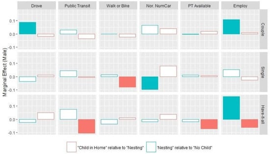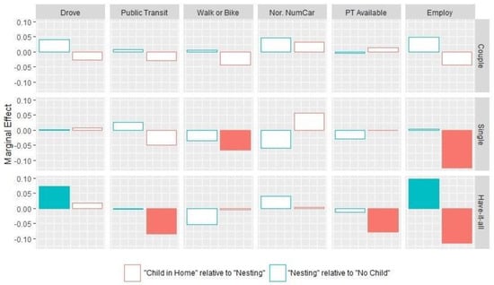 During the nesting phase, male Singles tend to reduce per-person car ownership (0.10 car/person less), which suggests that male Singles’ households tend to shed a car. Female Have-it-alls, on the other hand, show a larger increase in per-person car ownership (0.15 car/person more) than their male counterparts during the nesting phase, implying that female Have-it-alls households often acquire additional cars while preparing for the birth of their first child. Unlike the cohort level average behavior in the Couples cohort, male respondents here significantly increase driving (9%) and employment (11%). On the contrary, female Couples drive significantly less and have significantly lower employment than their male counterparts during the nesting phase. Male and female Singles, on average, do not show much difference in terms of transportation mode choices, residential location, and career decisions when they are in the nesting phase.