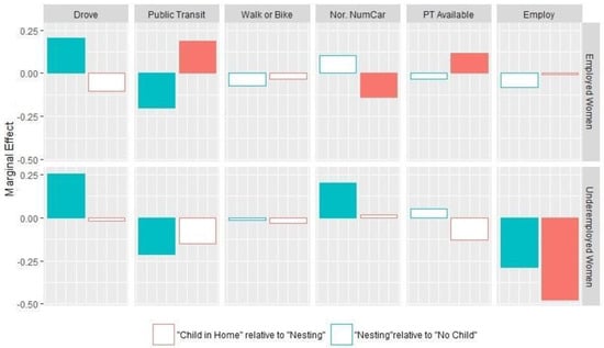 To explore how employment status interplays with gender differences in relation to parenting events in other mobility decisions, we performed a similar analysis using the model specification in Equation (2) but restricting the sample to only either employed women and employed men or underemployed women and employed men. The estimated marginal effects for employed and underemployed Have-it-all women are summarized in Figure 6. Note that the interpretation of the bars in Figure 6 should be the marginal effect relative to the effect of employed men.