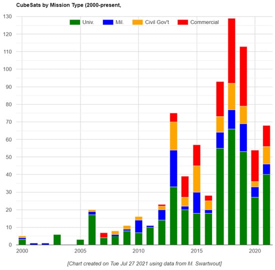 - Swartwout, M. Reliving 24 Years in the Next 12 Minutes: A Statistical and Personal History of University-Class Satellites. 2018. Available online: https://digitalcommons.usu.edu/cgi/viewcontent.cgi?article=4277&context=smallsat (accessed on 30 July 2021).