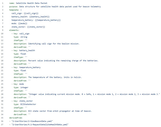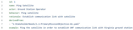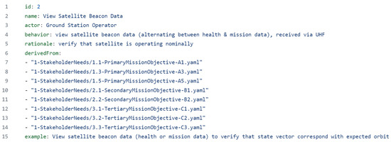 As an example, the second user story desire is to “verify that satellite is operating nominally” [13]. Its full statement, derived from the actor, behavior, and rationale, would read “as a Ground Station Operator I want to view satellite beacon data (alternating between health and mission data), received via UHF so that I can verify that satellite is operating nominally” [34]. Its associated YAML file named ‘2-ViewBeaconData.yaml’ is presented in Figure 15. Note that this user story is derived from stakeholder needs A1, A3, A5, B1, B2, C1, C2, and C3 which are stakeholder needs mentioned in the prior section detailing stakeholder needs. Additionally, the example statement is cut-off in Figure 15 for readability. It should read in full as “View satellite beacon data (health or mission data) to verify that state vector correspond with expected orbit profile and/or to validate that a mission mode was successful”. This satellite beacon data, transmitted via UHF, is used to validate that any and all functions of the satellite are operating nominally or as planned in respect to their payloads hence the large derived-from list in the associated YAML file.
