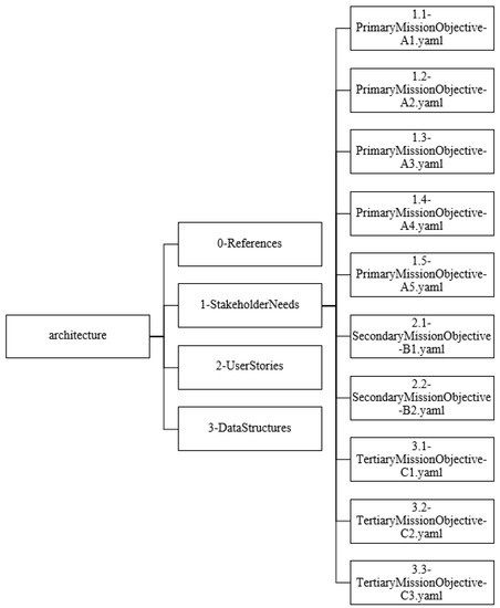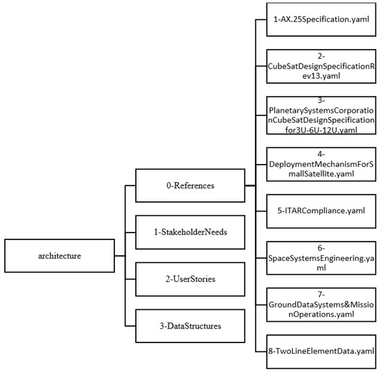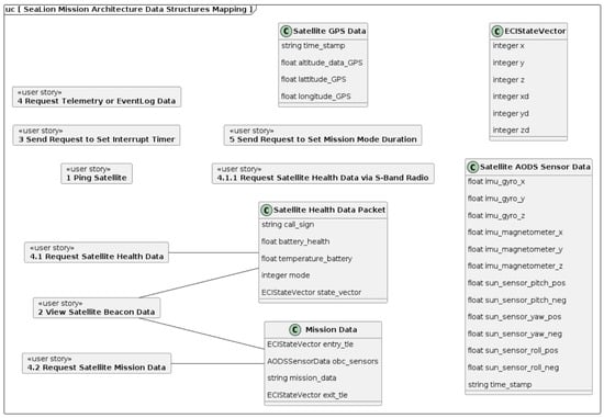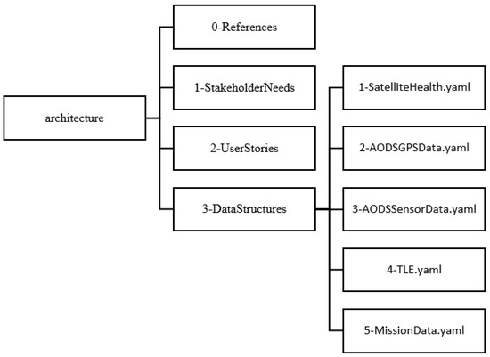 The SeaLion mission architecture is organized into two main folders of architecture and of components [13]. Architecture contains the references, stakeholder needs, user stories, and data structures shown in Figure 9. Components, as the name implies, contains the components and subcomponents of the CubeSat. For the focus of this article, the architecture folder is the primary concern. Components is currently a work in progress at time of publication of this article and will be addressed with future required work. For the mission architecture shown in Figure 9, generally data structures are derived from user stories. Furthermore, user stories are subsequently derived from stakeholder needs with their respective references.