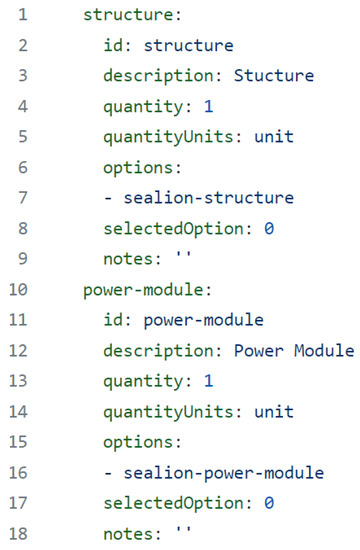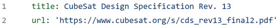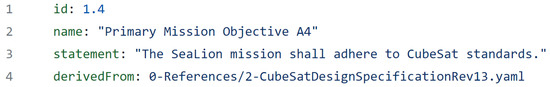 References are simply stored reference material such as standards, specifications books, etc. They are very simple two-line YAML files as shown in Figure 10. This creates a continued link between the YAML files within their respective folders from which documents can be updated seamlessly. Information changed within one file can interact with other files. All YAML references files in the mission architecture at the time of article’s publication is listed within Figure 9.
