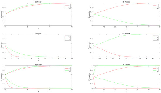 With Case 1 to Case 6, we performed the stability simulations of equilibrium points, and the simulation results are shown in Figure 8a–f.