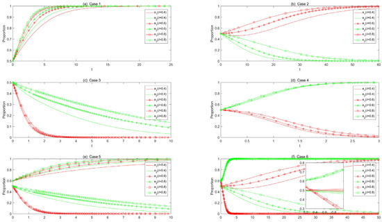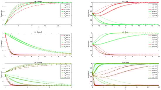With Case 1 to Case 6, we analyzed impacts of changes in customer physical feelings for the online retail channel on evolutionary paths, and the simulation results are shown in Figure 10a–f.