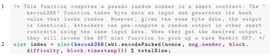 11], used in an NFT collection called Mphers. However, it has been exploited using a smart contract brute force technique, where the attacker generates multiple smart contracts to inject random inputs and guarantees minting a rare Mphers [
