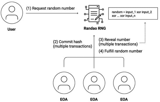 18] is an instance of the Commit–reveal scheme RNG, where participants “commit” a hash value to the Randao smart contract and then reveal an actual value later. In other words, people can directly and easily feed seed numbers to the Randao smart contract. This allows random numbers to be generated in a decentralized manner. Randao offers certain benefits. Firstly, it does not rely on any organization or development team. Secondly, there is no system requirement or complicated setup to be prepared before joining it. Hence, it is easy to adopt and scale to new blockchains. However, Randao’s significant limitation is the cost-efficiency issue. Computing a random number using the Randao method invokes many transactions. Thus, it is considered an expensive method compared to the others.