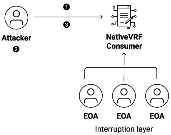 The attack steps are as follows. First, the attacker must extract all committed hashes, where represents the current number of commitments, and denotes the input data range. Next, the attacker must compute another input number with the desired random output. In the last step, the attacker must commit the data to bypass the interruption layer.
