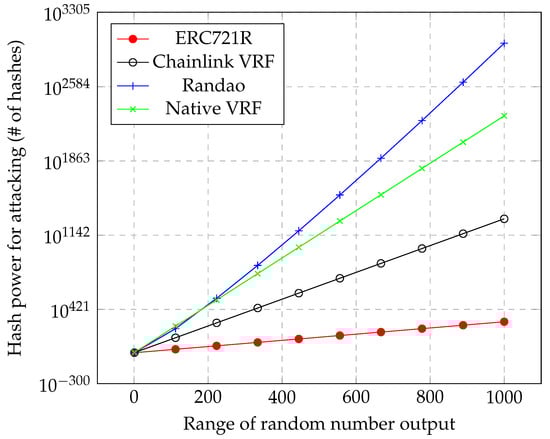 Figure 15. The chart uses a random output range as an input and provides the hash power required for attacking each method. Note that the Y axis is in the log scale. The experimental results demonstrated that Randao required the most hash power to be attacked. Native VRF, Chainlink VRF, and ERC721R offered lower security levels. When the highest hash rate of the Ethereum network was 1126 TH/s (