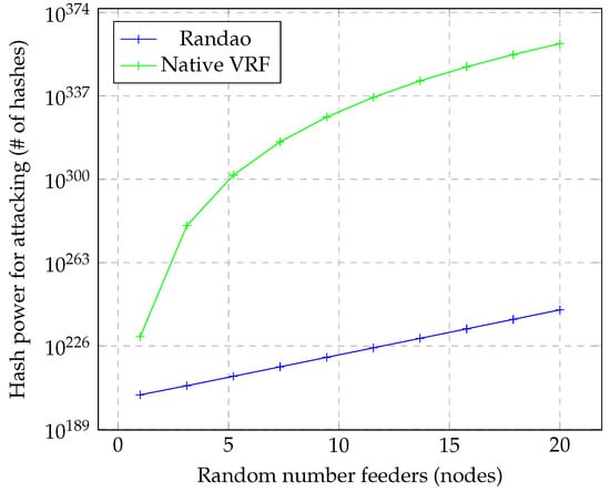 D, respectively. The random output range was fixed at 100. Here, we observed that the number of random feeders directly affected the security level of both RNG methods. Native VRF provided a higher security level when there were more data feeders. Compared to the Ethereum hash power benchmark (i.e.,