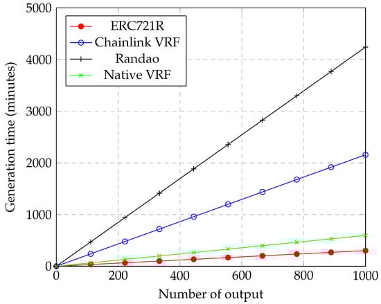 Figure 18 shows the throughput of each RNG. The x-axis represents the time elapsed in minutes. The y-axis indicates the number of random outputs generated in a period. ERC721R offered the highest throughput because it was the most straightforward method that only incurred one transaction per random generation. ERC721R could produce 3.3 outputs per minute. Native VRF provided higher speed than Chainlink VRF and Randao. This was because it only required two main transactions, request and fulfill. As a simplified process, Native VRF maintained a high speed with 1.67 random outputs per minute. Chainlink VRF was much slower than Native VRF because it incorporated Chainlink network operation, which was a complex process. It could generate 0.5 output per minute. Lastly, Randao was the slowest method since it contained five transactions for each random generation. It produced 0.25 output per minute. Overall, Native VRF was fast compared to other popular methods.