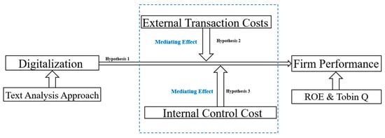 Digitalization has a profound impact on firms’ external transaction costs, and its effects are multifaceted. Firstly, digitalization can mitigate the costs arising from information asymmetry. By leveraging digital technologies, firms gain access to more transparent and comprehensive market information, which can help them formulate effective and sophisticated strategies. For instance, advanced tools such as big data sentiment indices, stock data visualization, and AI-powered market prediction systems can enable firms to develop a multi-level market strategy layout and an intelligent and efficient operation management model. As a result, firms can enhance their core product competitiveness and improve their operational efficiency [,]. Secondly, digitalization can enhance transactional efficiency by providing firms with more researchable data. Technologies such as artificial intelligence, blockchain, cloud computing, and big data enable firms to adopt user-oriented product competition strategies. Empowered by digital technologies, enterprises are enabled to undertake comprehensive customer demand analysis, establish intricate user profiles, and integrate user data into their product management processes. Studies indicate that integrating user data into production management leads to more effective business productivity and enhances firms’ competitiveness []. Thirdly, digital technologies help firms overcome traditional constraints, such as regional culture, language barriers, and country differences. By breaking the constraints of the physical environment on the supply of products, digital technologies enable firms to create more value for users in both time and space. Furthermore, digital technologies catalyze the deeper development of firms’ innovation capabilities by providing advantages in information, technology, and resource integration. This reduces the cost of communication and collaboration between firms, enabling them to streamline their processes and focus on core competencies []. Based on these arguments, this paper proposes the following hypothesis: