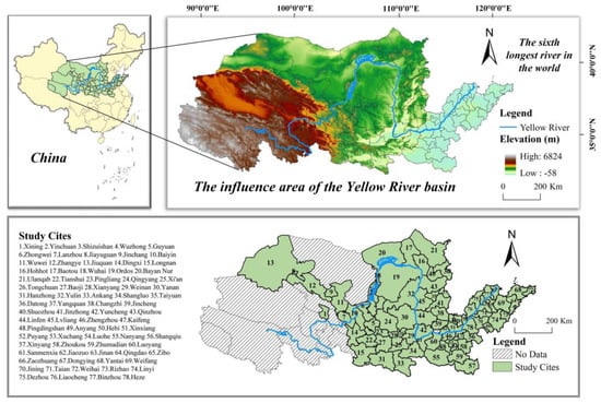 The Yellow River, China’s “Mother River”, is the sixth longest river in the world, with a total length of 5464 km. It is located at 32~42° N, 95~120° E, with a watershed area of 795,000 km2, which originates from the Bayankara Mountain Range on the Qinghai–Tibet Plateau and injects into the Bohai Sea from Kenli County in Shandong Province. It flows through nine provinces in China, including Qinghai, Sichuan, Gansu, Inner Mongolia, Ningxia, Shanxi, Shaanxi, Henan, and Shandong. The scope of the Yellow River Basin (YRB) delineated in the paper is referred to in the document issued by the Yellow River Water Conservancy Commission of the Ministry of Water Resources (YRCC), PRC [51]. In addition, the document titled “Outline of the Yellow River Basin’s Ecological Protection and High-quality Development Plan” issued by the State Council of China in 2021 is also an important reference for this study [52]. However, due to the severe lack of data in 11 cities (Alxa League, JiCNY, Linxia Hui Autonomous Prefecture, Gannan Tibetan Autonomous Prefecture, Haidong, Haibei Tibetan Autonomous Prefecture, Huangnan Tibetan Autonomous Prefecture, Hainan Tibetan Autonomous Prefecture, Guoluo Tibetan Autonomous Prefecture, Yushu, and Haixi Mongolian and Tibetan Autonomous Prefecture), only 78 prefecture-level cities in the basin were selected as the case study sites (Figure 1). The reasons for taking the YRB as a case study site of TES are as follows: