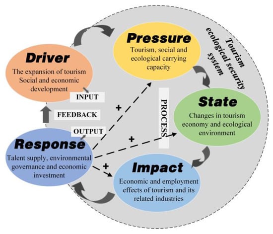 TES is a derivative of the concept of ecological safety, and it is an important research topic in tourism ecology for which there is no uniform definition yet. Currently, most scholars emphasize that TES refers to the ecosystem of tourist destinations that do not experience a decline in quality or even irreversible damage due to tourism activities [1,2]. In addition, it is a harmonious and orderly state between tourism and social, economic, and ecological systems [53,54]. Based on the above analysis of TES and existing studies, combined with open systems theory, the DPSIR model was embedded into the study of TES and the TES conceptual model was constructed (Figure 2).