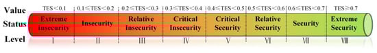 The classification of tourism ecological security has not yet formed a unified standard. Referring to the existing classification standards [17,21,28,40], and according to the measurement results of TES, the TES of the YRB were divided into I (Extreme Insecurity), II (Insecurity), III (Relative Insecurity), IV (Critical Insecurity), V (Critical Security), VI (Relative Security), VII (Security), and VIII (Extreme Security) (Figure 3).