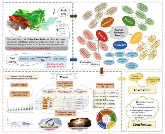 This paper proposes a research framework to assess the spatial–temporal dynamic evolution and driving mechanism of TES in 78 cities in the YRB. First, we collect relevant data and build an evaluation system for TES based on the DPSIR model. Second, the entropy-weighted TOPSIS method is used to measure TES level. The spatiotemporal dynamic evolution characteristics of TES are explored by combining spatial autocorrelation, spatial trend surface, and Markov chain. Moreover, its driving mechanism is analyzed by Geo-Detector. Finally, the study proposes relevant policy implications based on the results (Figure 4).