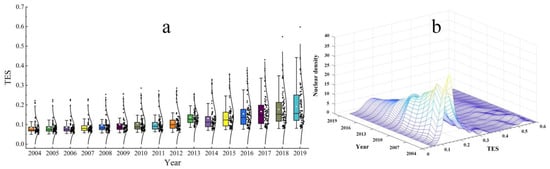 According to Formulas (1)–(9), the entropy-weighted TOPSIS method was used to measure the TES value of 78 cities in the Yellow River basin from 2004 to 2019 (Appendix A), and its temporal evolution characteristics were analyzed based on the results. Figure 5a shows that the average value of TES in the YRB has a steady upward trend, from 0.084 in 2004 to 0.192 in 2019, with an average annual growth rate of 8.5%. However, it is still deficient, indicating that the YRB faces a high ecological safety risk. Moreover, the “boxes’” heights have increased continuously, indicating that the differences in the TES value have gradually widened. The scatter plots show that the levels of TES always manifest in a “pyramid” structure, indicating that most cities have low TES values, and only a few have broken out of “low-level equilibrium”. Furthermore, Figure 5b shows that the curve moves to the right, the peak body gradually widens, and the peak height gradually decreases, reflecting the phenomenon of “club convergence” of TES, which further confirms the conclusion that the difference in TES gradually increases. In the “tail” of the nuclear density curve, small waves are always present and tend towards higher values, indicating that the few cities with higher values of TES are in an excellent position to develop.