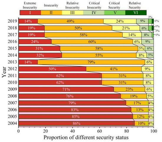 In addition, according to the classification standard of the TES level, the TESs of 78 cities were graded, and the changing trend of the number of each level was analyzed. As shown in Figure 6, there were six categories of TES in the Yellow River Basin during 2004–2019, which included I (Extreme Insecurity), II (Insecurity), III (Relative Insecurity), IV (Critical Insecurity), V (Critical Security), and VI (Relative Security). In general, the number of I decreases significantly, the number of II shows a trend of increasing first and then decreasing, the number of III gradually increases, and the cities in categories IV, V, and VI have grown out of nothing but account for a small proportion. Specifically, the proportion of I dropped from 86% to 14%, indicating that the improvement in TES in the YRB achieved initial results. The continuous deterioration of the ecological environment in most cities has been reversing since 2004, when the Ministry of Ecology and Environment of the PRC issued the “Construction Indicators for Ecological Counties, Ecological Cities and Ecological Provinces”. The number of IIs showed a continuous upward trend from 2004 to 2013, especially in 2013, and the proportion increased rapidly from 41% in the previous year to 79%. This is because the Chinese government made the strategic decision of ecological civilization construction at the end of 2012, which led urban governments to adopt strict environmental regulations under the pressure of political assessment, resulting in a rapid improvement in the ecological environment in a short time [62]. Moreover, in the same year, the China National Tourism Administration (CNTA) established seven national-level ecotourism demonstration areas in the YRB, including the Yuntai Mountain Demonstration Zone in Jiaozuo, the Yao Mountain–Giant Buddha Demonstration Area in Pingdingshan, the World Expo Park Demonstration Area in Xi’an, the Dangzhou Grassland Demonstration Area in Gannan, the Xinglong Mountain Demonstration Area in Lanzhou, and the Shapotou Demonstration Area is in Zhongwei. They play a key role in the improvement of TES in the YRB. However, within China’s politically competitive system, the effectiveness of policies has decreased over time [63], and many IIs reverted to category I by 2014. From 2014 to 2019, the proportion of IIs showed a fluctuating decline due to many cities upgrading to higher tiers. The share of IIIs gradually increased from 4% in 2004 to 24%, and they ranked second in 2009. Moreover, since Jinan, Zhengzhou, TaiCNY, and Xi’an became stage IV cities in 2014, the proportion of stage IV cities gradually increased to 9% in 2019. Xi’an was promoted to V in 2017, and Zhengzhou and TaiCNY were also promoted from IV to V the following year. In 2018, Xi’an became the only city in VI, which shows that Xi’an has achieved great success in improving TES.