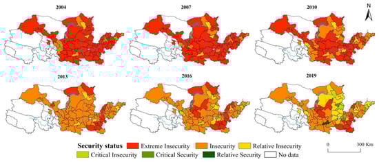 On the spatial scale, to clarify the spatial distribution characteristics of TES in the YRB, the years 2004, 2007, 2010, 2013, 2016, and 2019 were selected and visualized using ArcGIS 10.8. As shown in Figure 7, the overall situation of TES in the YRB is poor, with the high-value cities showing a “scattered” spatial distribution, most of which are along the river. However, the development trend is positive during the study period. Specifically, the TES status of most cities from 2004 to 2010 was extremely insecure, and only the cities located in the Tao River Basin, Hetao Plain, and the Yellow River Delta had a relatively good safety status. On the one hand, the ecological environment of the YRB is fragile, with the SanjiangCNY Reserve and Qilian Mountains in the upper reaches, the Loess Plateau in the middle reaches, and the Yellow River Delta in the lower reaches being highly vulnerable to ecological degradation. On the other hand, the ecological environment has been seriously damaged by over-tourism, which has brought ecological problems, such as carbon emissions, soil consolidation, and soil erosion. From 2010 to 2013, the TES in the YRB rapidly improved, and the number of I cities decreased rapidly from 48 to 11. This is because the Chinese government started to adopt the strategy of ecological civilization construction, and emphasized the importance of developing low-carbon green tourism. From 2013 to 2019, the TES status of the Yellow River basin showed significant spatial divergence, in which the cities located in the Hexi Corridor, Wei River basin, and the East Henan Plain still exhibited a status of extreme insecurity. However, the cities located in the Fen River basin and the Yellow River delta generally became better. This is due to the rapid development of low-carbon tourism and ecotourism in Shanxi Province, located in the Fen River Basin, and Shandong Province, covering the Yellow River Delta under the guidance of the Eco-Province Construction Program. In contrast, the cities with statuses of extreme insecurity still focus on sightseeing tours, which cause significant damage in the ecological environment.