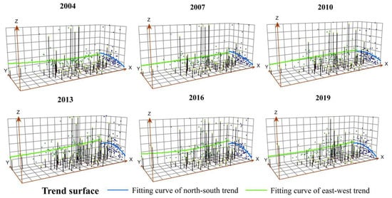 The trend surface is used to analyze TES’s spatial distribution pattern and evolutionary trends. The trend surface model was constructed assuming that Ri is the TES value of a city in the YRB and (Xi, Yi) is the city’s coordinates.