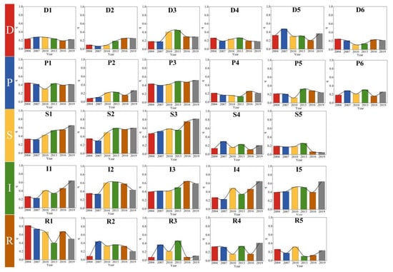 - State (S). The state factor is evaluated based on the tourism economy and ecological environment. Domestic tourism income (S1), tourism foreign exchange income (S2), and per capita tourism income (S3) are used to assess the tourism economy. Moreover, the green coverage rate of the built-up region (S4) and the annual average concentration of inhalable particles (S5) are used to evaluate the ecological environment.