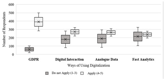 In 2020, economic entities mainly applied GDPR digitalization (782), digital interaction platforms (543), analog data digitalization (526), and rapid analytics (476). We compared the most common forms of digitalization that economic entities apply to the size of the economic entity and the prevailing ownership (Table 1). Respondents again determined the same four elements for the importance of digital technologies. The change occurred in their order—GDPR digitalization (772), analog data digitalization (587), digital interaction platforms (576), and finally, fast analytics (540).