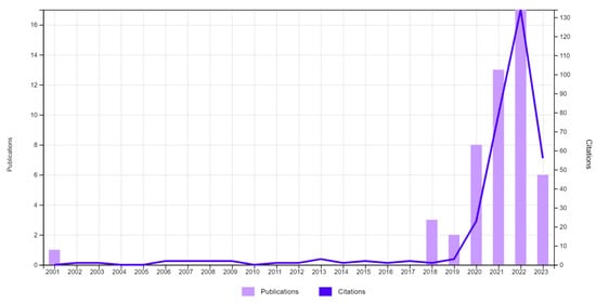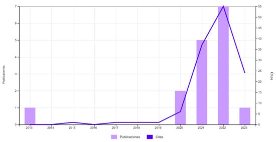 In this sense, one of the most relevant group decisions that companies are currently developing is to implement the digital transformation of their business. Again, after searching in the Web of Science Core Collection and including unique criteria of selecting journal article documents and including the entire period available, we can present Figure 2, which reveals the publications and citations associated with the search variables (TS = (CONSENSUS PROCESS) OR TS = (MAKING DECISION GROUP)) AND (TS = (BUSINESS) OR TS = (ENTERPRISE)) AND (TS = (DIGITAL TRANSFORMATION) OR TS = (DIGITAL MATURITY)).