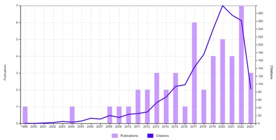Figure 5 presents a comprehensive overview of the publications and citations associated with the search variable TS = (DIGITAL MATURITY MODELS). The objective was to discover the scientific publications related to this concept. For these results, we have conducted the research in the Web of Science Core Collection including unique criteria of selecting journal article documents and including the entire period available.