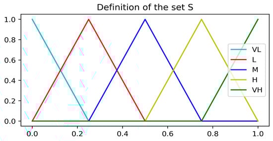A model known as the 2-tuple linguistic representation, which was proposed by F. Herrera and L. Martinez [], addresses the challenge of mitigating information loss during the computation process with linguistic labels. This model aims to enhance the accuracy of representing information by unifying it into linguistic values. In the following paragraphs, a concise overview of the 2-tuple linguistic representation model and its computation system will be presented. This model aims to improve the accuracy of representing information by consolidating it into linguistic values (, , where and . The membership function selected for the 2-tuple linguistic representation model is typically represented by a triangular function. Figure 9 depicts an illustrative representation of the domain within using this triangular function.