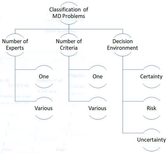 The decision-making (DM) process involves several crucial factors that need to be taken into consideration. These factors include the number of criteria, the decision environment, and the number of experts []. Figure 10 provides an overview of these factors.