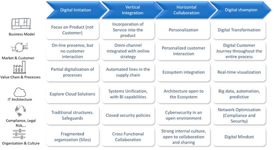 - Berghaus, S.; Back, A. Stages in Digital Business Transformation: Results of an Empirical Maturity Study. Completed Research. Association for Information Systems AIS Electronic Library (AISeL). 2016. Available online: http://aisel.aisnet.org/mcis2016/22 (accessed on 1 June 2023).