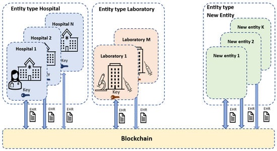 The entities are characterized by type, but each of them has its own identity within the network. For example, a hospital-type entity can be determined to have certain attributes and characteristics. Then, for a given hospital to be integrated into the network, it must be clearly identified through an identifier code that will differentiate it from other hospitals. Each organization also has specific types of users with people roles. Users enrolled in the institution interact directly with the EHRs. The administrative system determines the access permissions to the EHR according to the institution to which the user belongs and the roles he/she has within the institution. The proposed model has the flexibility to create new organizations or institutions that adapt or adjust to the reality of the region where the system is applied. Figure 2 shows an outline of the proposed architecture.
