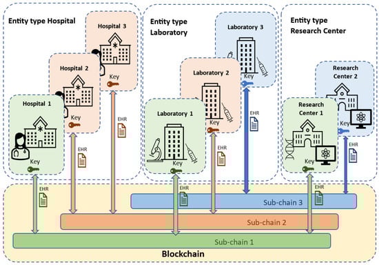 As organizations are added, network performance is clearly affected. An organization, such as a hospital or healthcare facility, for example, brings many users to the network. Our proposal addresses the scalability issues by implementing the use of sub-chains within the blockchain structure. These sub-chains would integrate some participating organizations of the network, which manage medical data more efficiently and privately. An example of the sub-chain concept is shown in Figure 3.